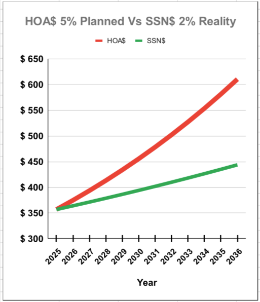 8. Therefore, HOA members on social security have their limited resources eaten up by the HOA board’s insistent on 5% annual increases in dues. If some reduction in annual increases does not occur, it will become increasingly difficult to even resell HOA units.
